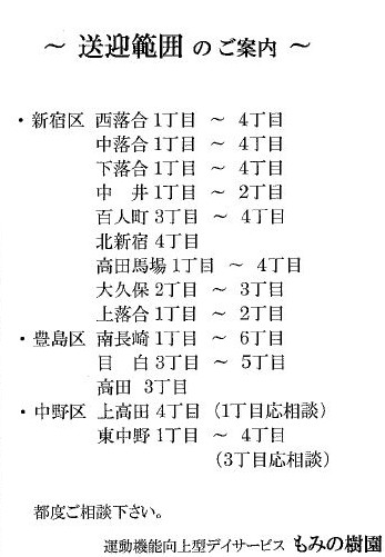 デイサービスとは、日帰りで施設にお迎えし、レクリエーション活動や食事サービス、入浴サービスなどを提供する通所介護施設 送迎エリア ・新宿区中落合1~4丁目、西落合1~4丁目、上落合1~3丁目、下落合1~4丁目、中井1~2丁目、高田馬場1~4丁目. |